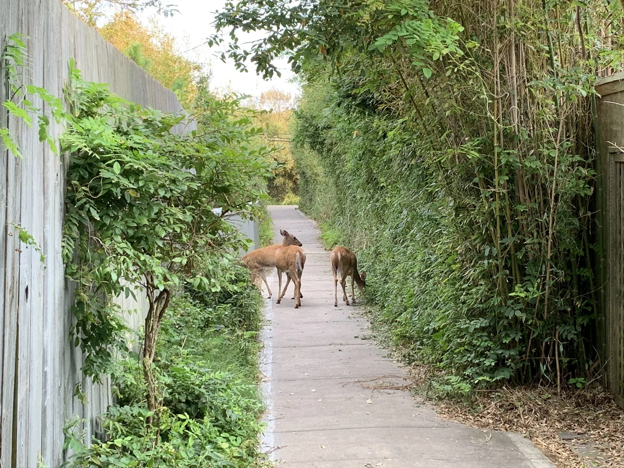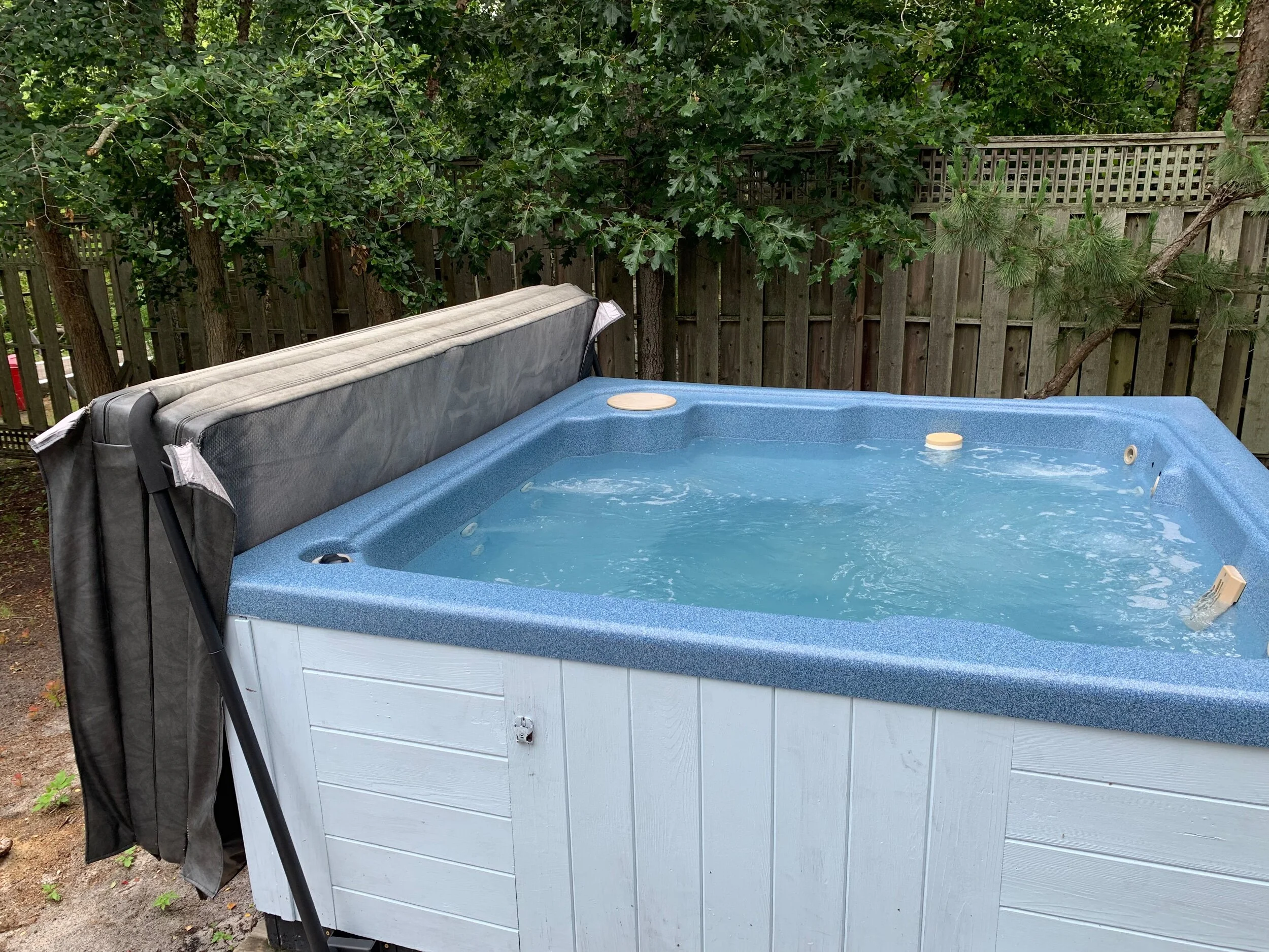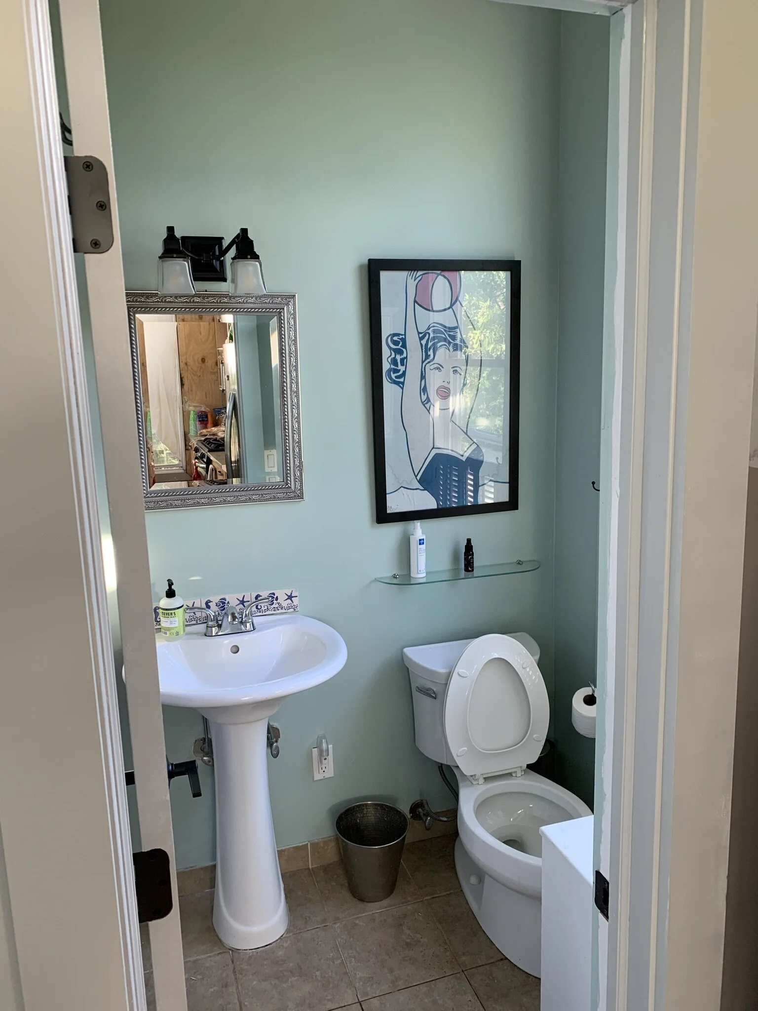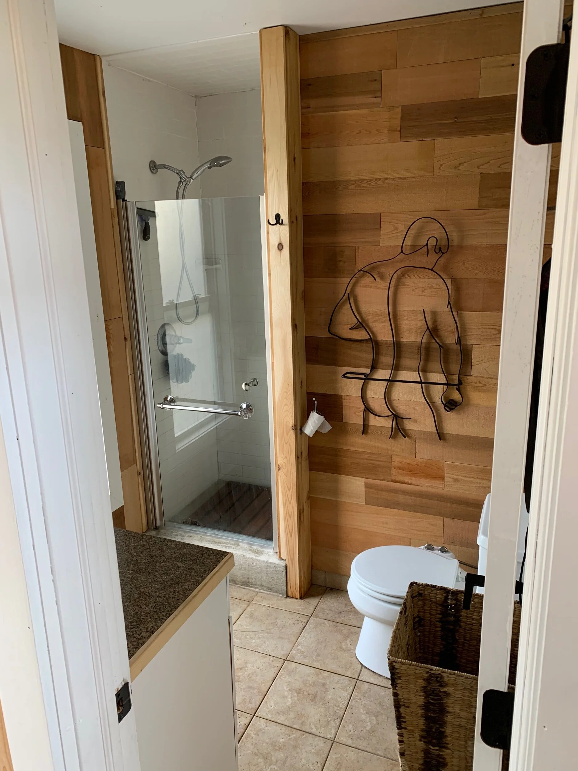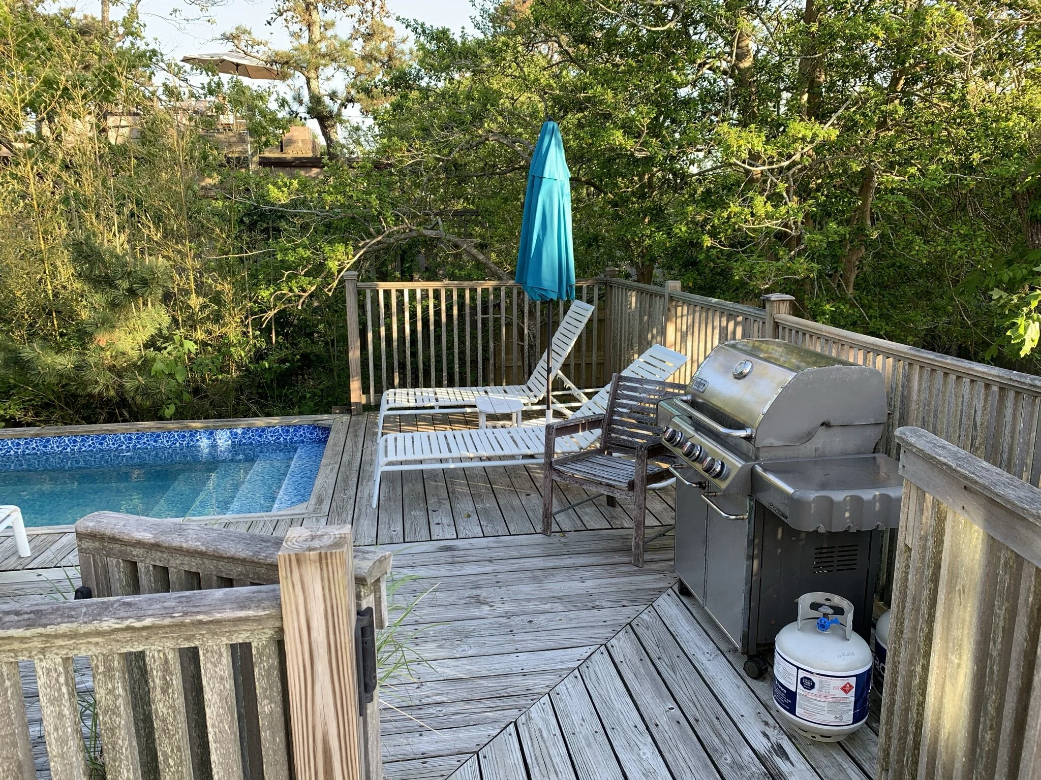 Upon entering the main deck are sliding doors for the “blue room” (left) and the “wood room” (right). The wood room also has a second sliding door onto the pool area. Past these rooms and the pool is the front door to the house and a deck entrance for the interior ensuite room. Going through the house from the front door are the inside entrances to the three interior bedrooms, the first floor shared bathroom, and the stairs to the second floor as well as the door out to the back deck. On the back deck is the laundry shed and the hottub. Following the deck to the left and around the corner is the entry for the private “owner’s suite.” Past the owner’s suite, on the next corner of the deck is the 7’ x 7’ outdoor shower (fits a group!) and finally a return to the main entrance gate.