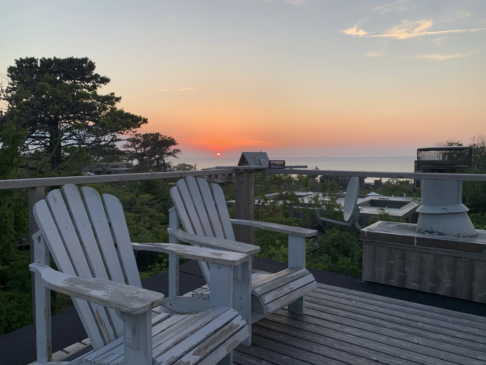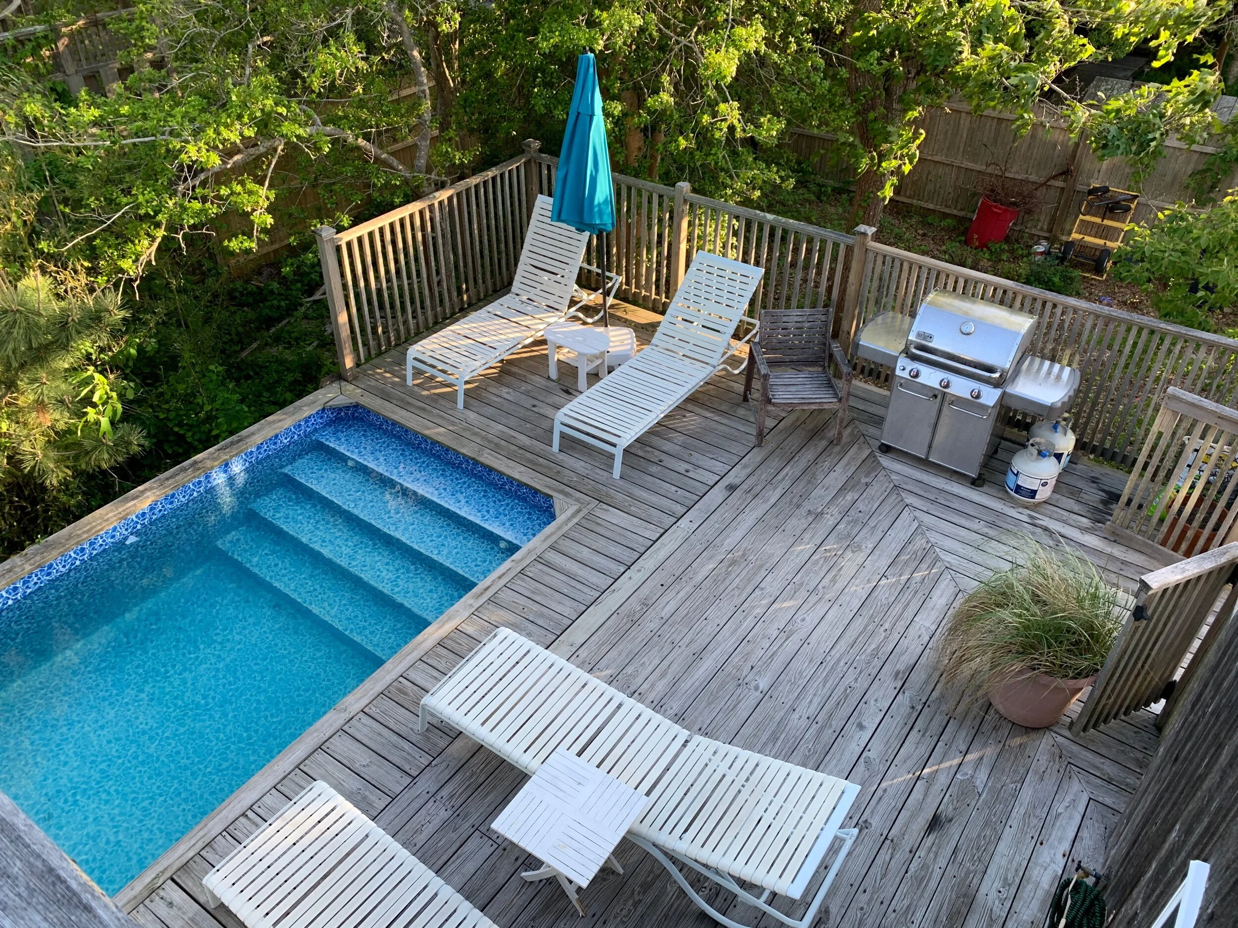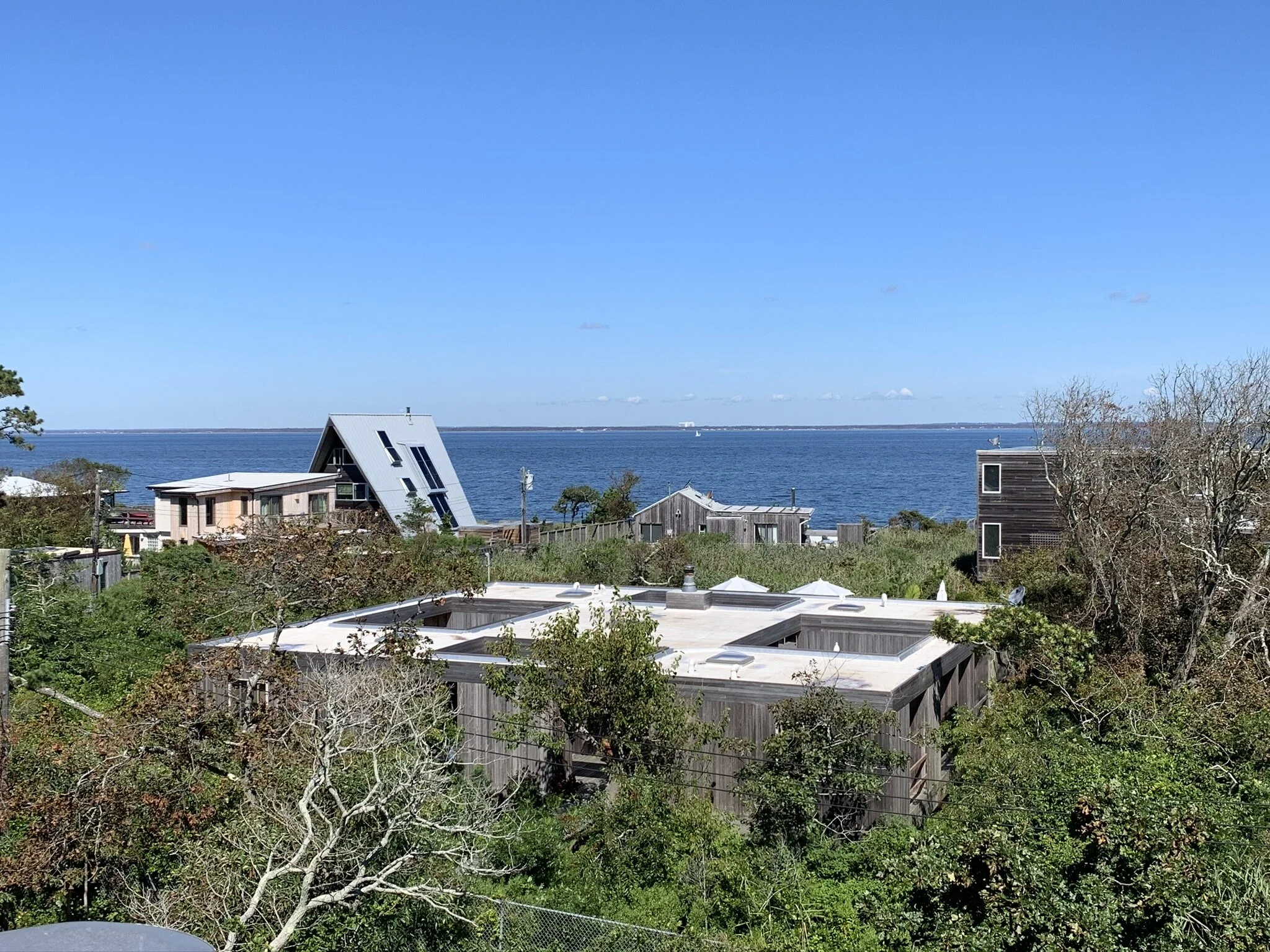 The interior stairway leads to the open plan second floor, landing at the doors to the south facing second floor deck (facing the pool). The kitchen and dining area are at the east of the second floor, and the livingroom to the west. The second floor full bathroom is behind the stairs. Past the livingroom and the fireplace are doors to the North facing second floor deck with views of the Great South Bay, and then exterior stairs from the second floor deck up to the roofdeck.
