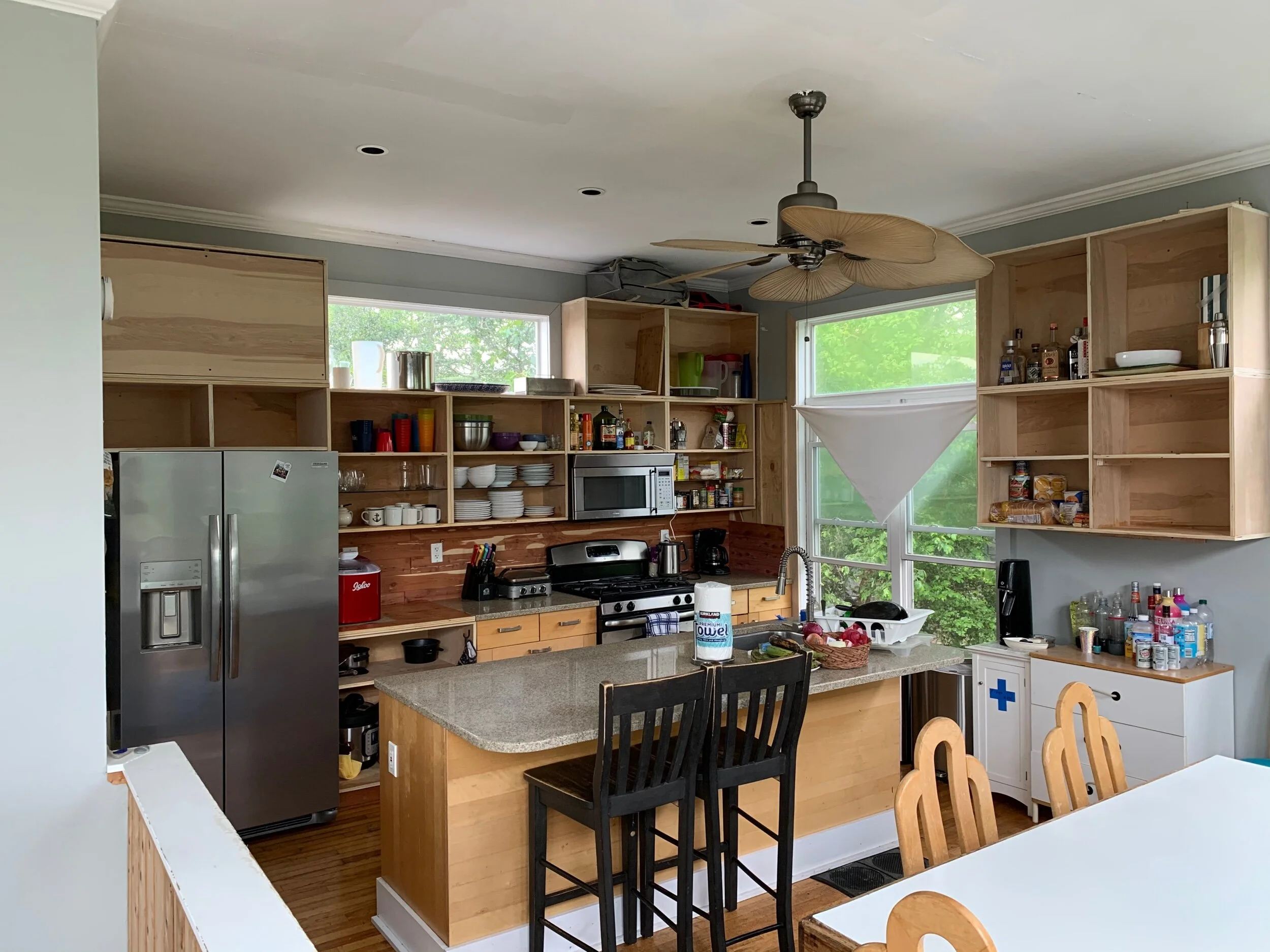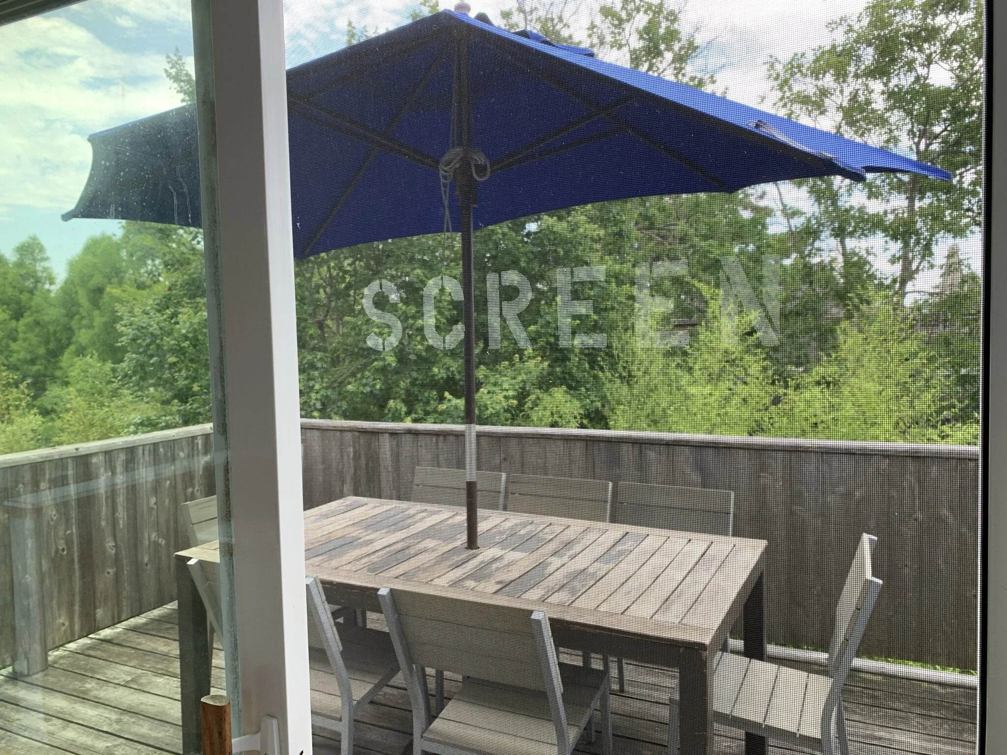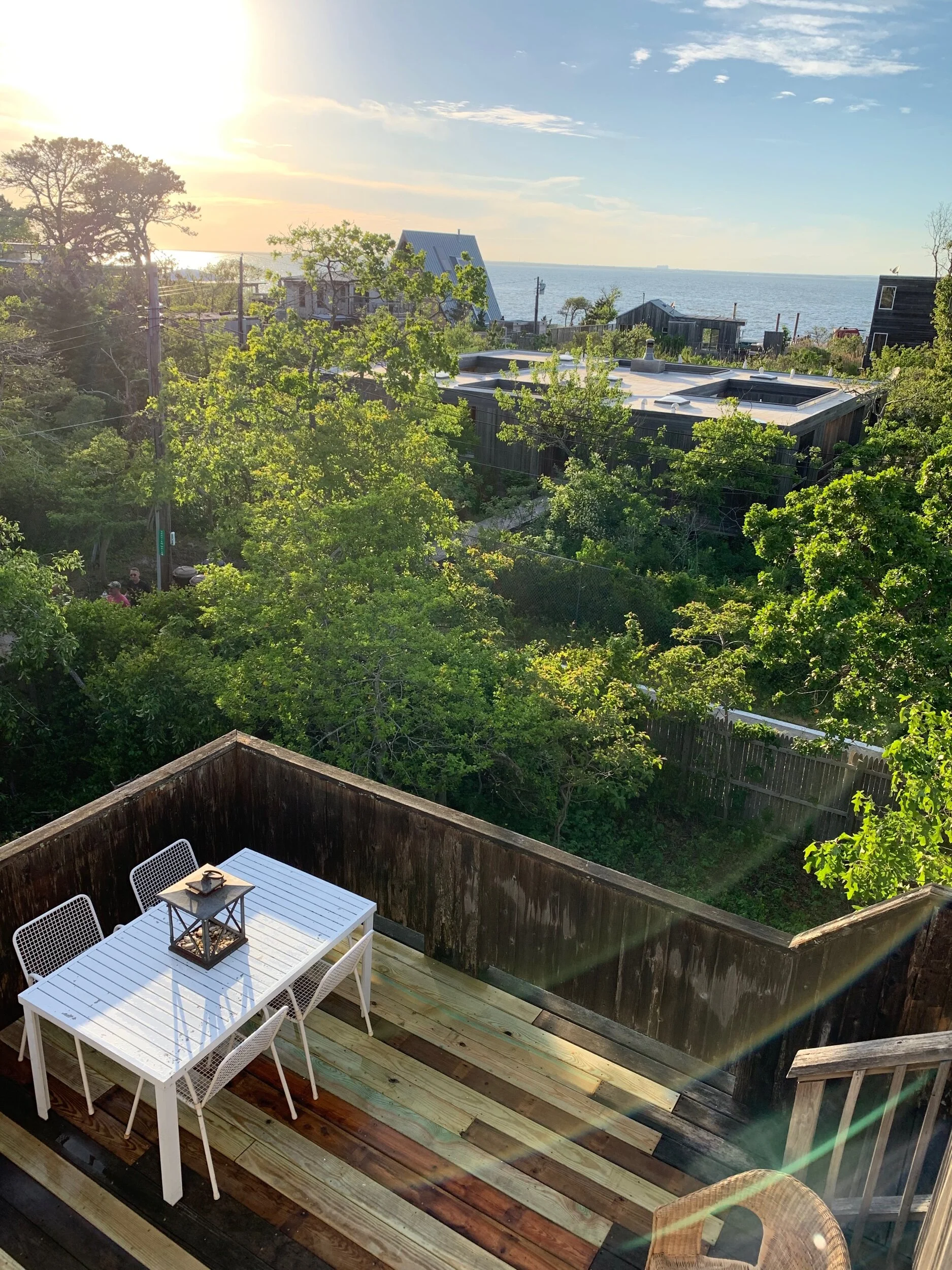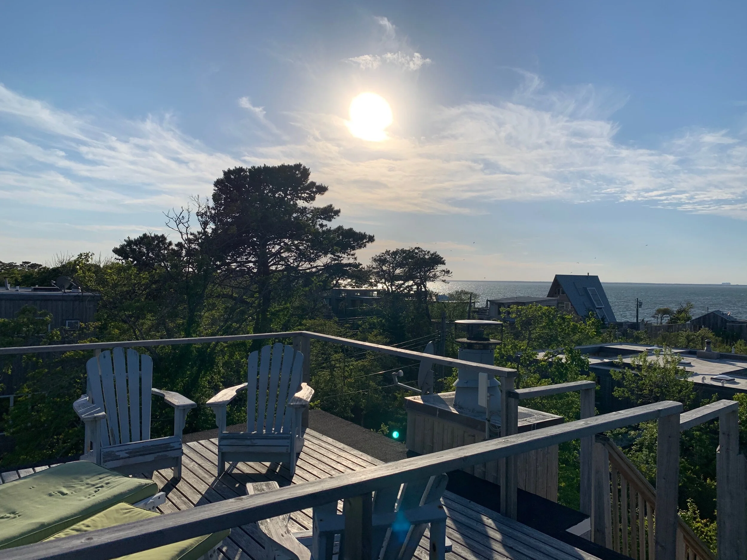 The interior stairway leads to the open plan second floor, landing at the doors to the south facing second floor deck (facing the pool). The kitchen and dining area are at the east of the second floor, and the livingroom to the west. The second floor full bathroom is behind the stairs. Past the livingroom and the fireplace are doors to the North facing second floor deck with views of the Great South Bay, and then exterior stairs from the second floor deck up to the roofdeck.
